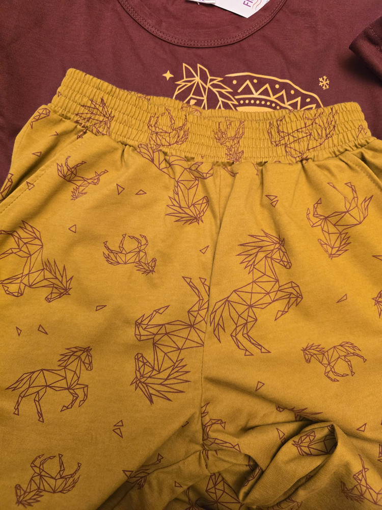 Штаны выполнены из мягкого хлопкового трикотажа с набивным рисунком лошадей. Модель имеет свободный крой и обеспечивает полную свободу движений. В боковых швах предусмотрены удобные карманы, которые делают пижаму ещё практичнее. Широкий пояс на мягкой резинке с прострочкой обеспечивает комфортную посадку, не давит и не перекручивается.